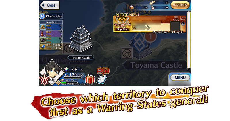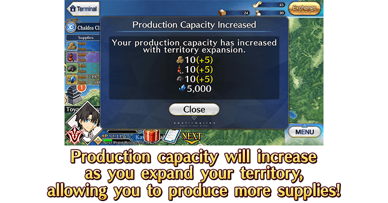 "Military Rations", "Black Gunpowder", "Tatara Iron", and QP will be produced when you clear certain event quests. As your army's territory expands, production capacity will increase, allowing you to produce more supplies and munitions.