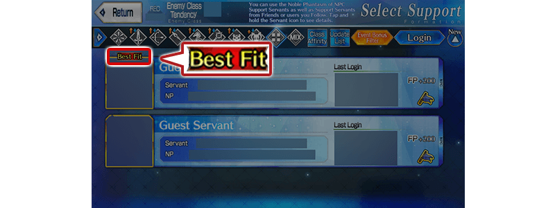 In certain quests, choosing the right NPC Servant can be the key to victory. NPC Servants with the "Best Fit" icon displayed will be especially helpful in the upcoming battle, so be sure to bring them along.