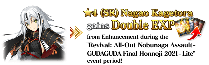 If you got "★4 (SR) Nagao Kagetora" in the original Limited Time Event "All-Out Nobunaga Assault - GUDAGUDA Final Honnoji 2021", bonus rewards will be available in this event.
