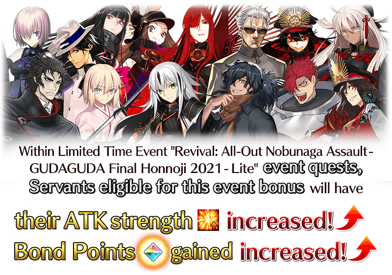 Certain Servants will receive bonuses to their ATK strength and Bond Points Gained within this event "Revival: All-Out Nobunaga Assault - GUDAGUDA Final Honnoji 2021 - Lite".