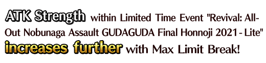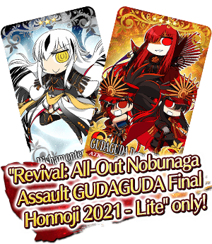 * In-game graphics may vary from the images used within this article. * This event is a "Revival - Lite" version of the 2021 Limited Time Event "All-Out Nobunaga Assault - GUDAGUDA Final Honnoji 2021". Certain elements have been adjusted for a more enjoyable experience. * Certain quests will be unlocked at a later date. * The "Repeated Battle" function cannot be used within this event.