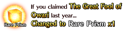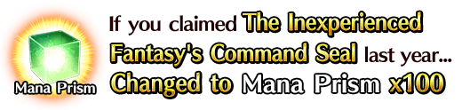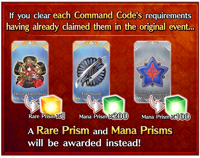 If you already received the Command Codes in the original Limited Time Event "All-Out Nobunaga Assault - GUDAGUDA Final Honnoji 2021", you will receive a Rare Prism or Mana Prisms instead of the Command Codes.