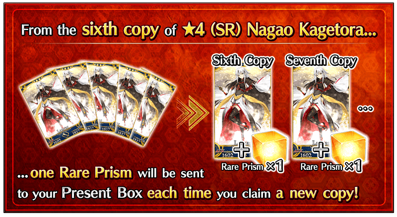 Once you have acquired a total of six copies of "★4 (SR) Nagao Kagetora", one Rare Prism will be awarded for each new copy, beginning with the sixth.