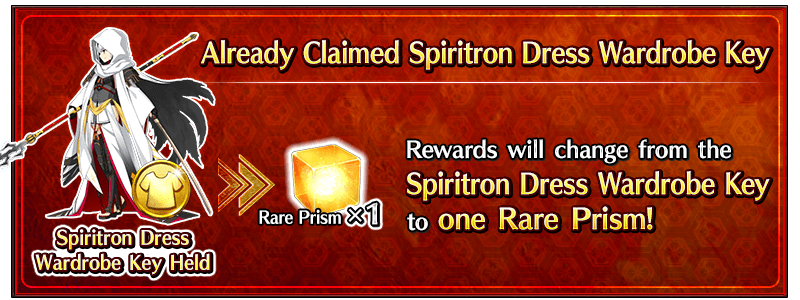 Masters who obtained the Spriton Dress Wardrobe Key during the original 2021 Limited Time Event "All-Out Nobunaga Assault GUDAGUDA Final Honnoji 2021" will receive a Rare Prism in place of the Wardrobe Key.