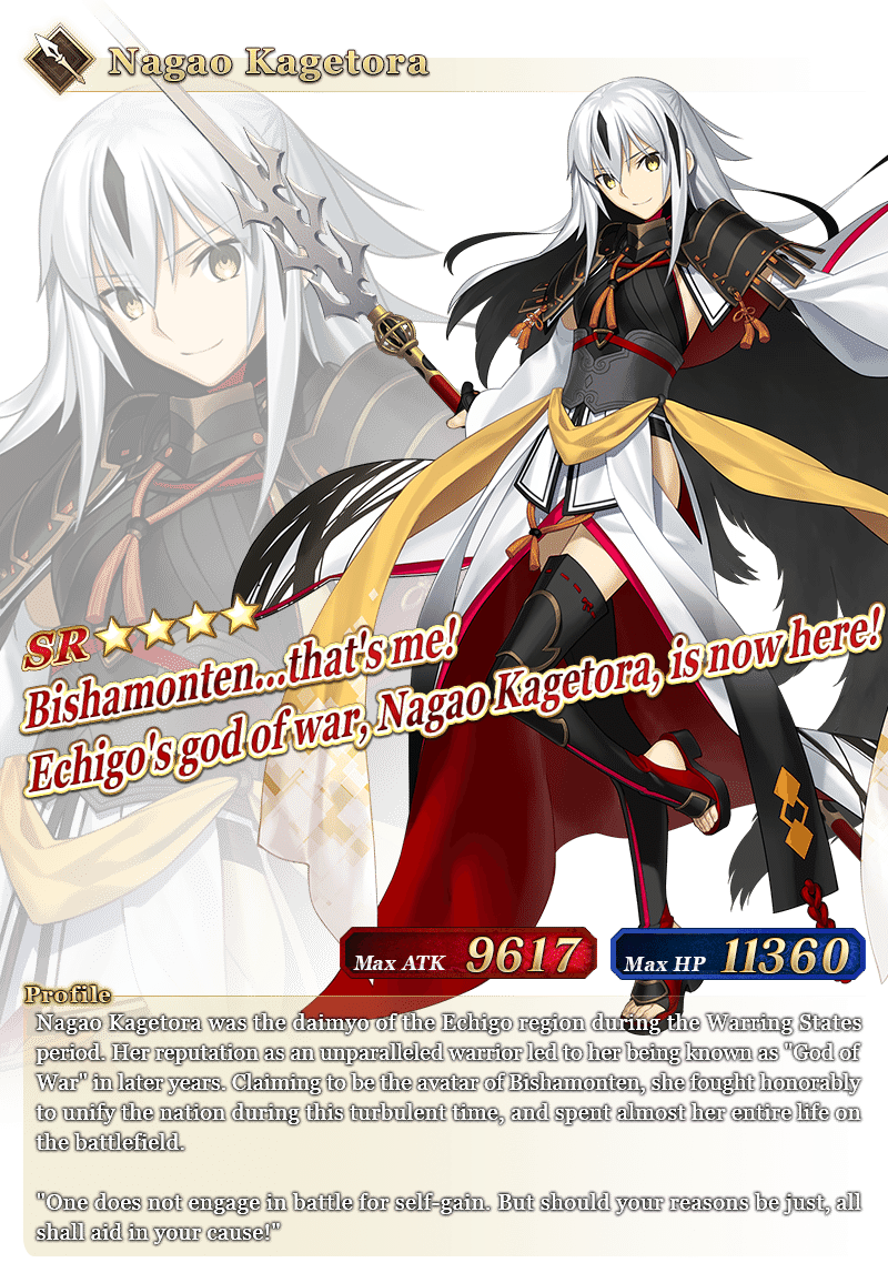 Event Limited Servant "★4 (SR) Nagao Kagetora" will officially join your roster once you clear the Epilogue. The Epilogue will be unlocked at a later date.