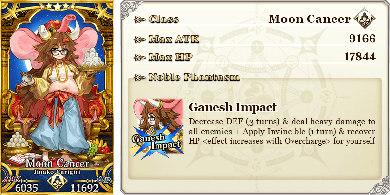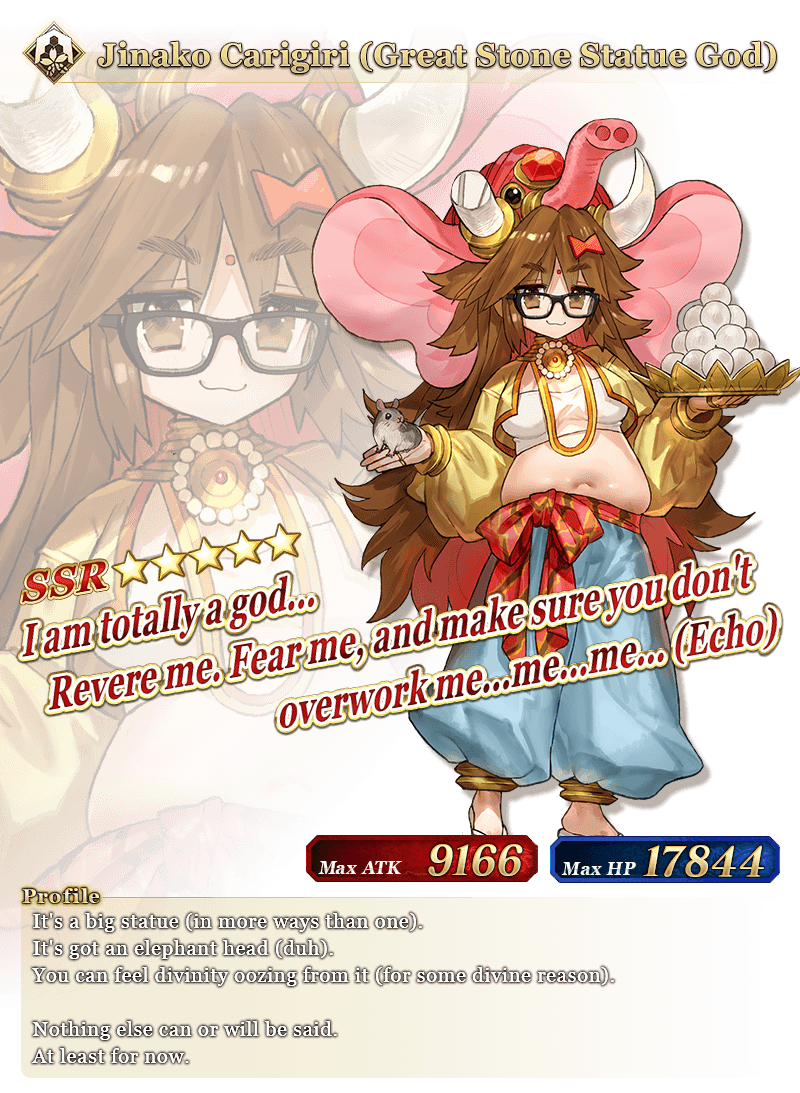 * Please note that this illustration is of the Servant's 2nd Ascension. * The name displayed for "★5 (SSR) Jinako Carigiri (Great Stone Statue God)" will change from "★5 (SSR) Great Stone Statue God" to "★5 (SSR) Jinako Carigiri" with Stage 2 Ascension.