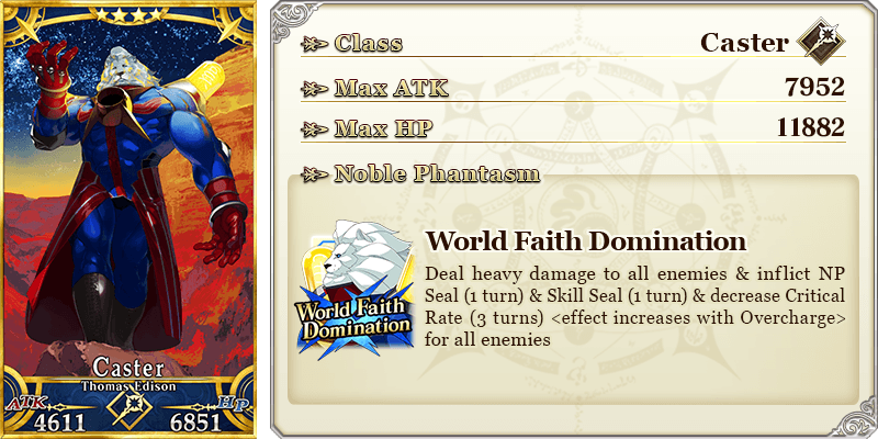 ★5 Osakabehime (Assassin) ★5 Jinako Carigiri (Great Stone Statue God) ★4 Nursery Rhyme ★4 Thomas Edison |