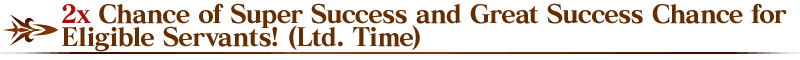 For the following period, when Enhancing the six Servants with new Interludes, chances of a Super Success (double EXP) and Great Success (triple EXP) will be doubled for a limited time!