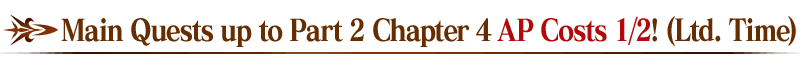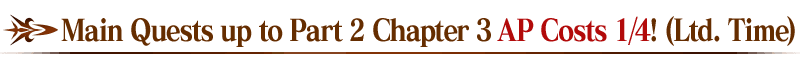 For the following period, AP costs for Main Quests through Part 2 Chapter 3 will be 1/4! (AP costs will be 1/4 even if you withdraw from battle.)