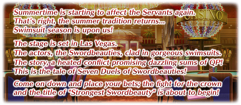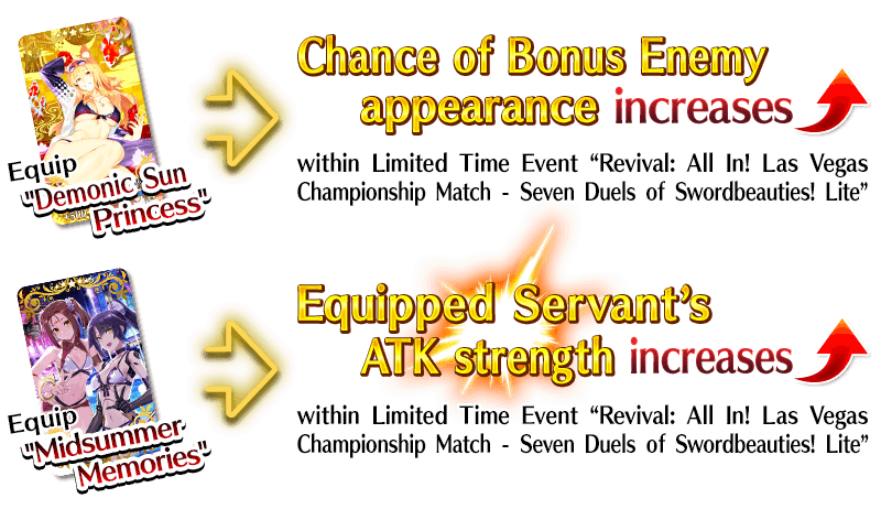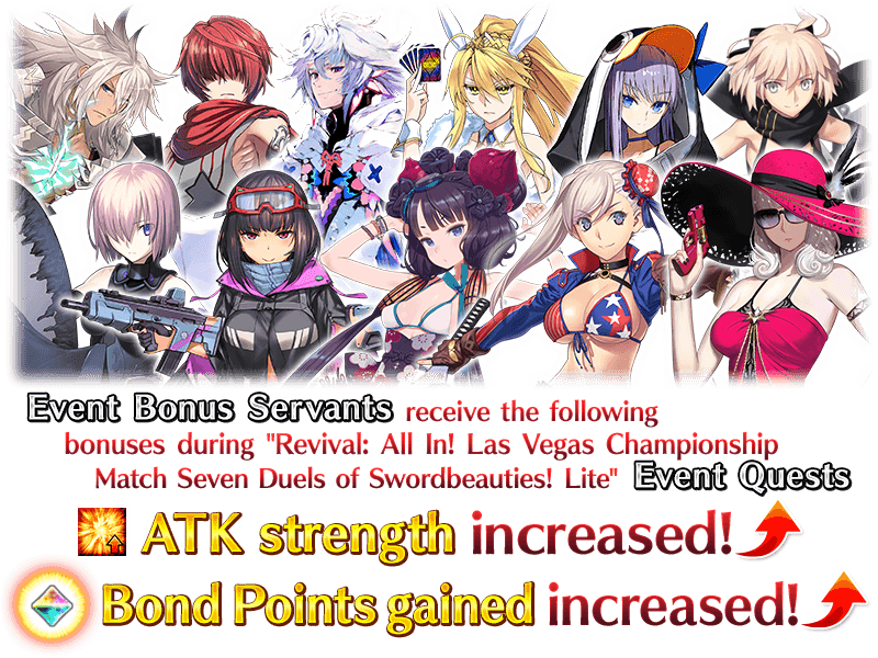 Certain Servants will receive an ATK bonus and a Bond Points Gained bonus within event quests in the Limited Time Event "Revival: All In! Las Vegas Championship Match - Seven Duels of Swordbeauties! Lite".