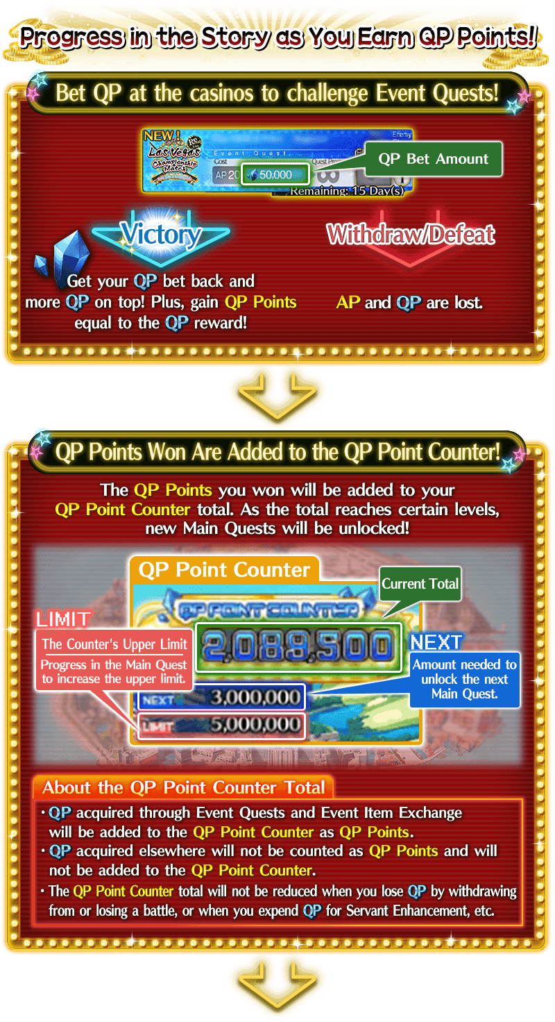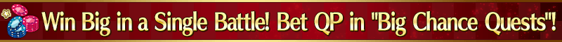 "Big Chance Quests" are high risk, high return quests where you can bet large amounts of QP! Be sure to use Servants you've fully strengthened to clear these quests on the first try and receive lots of QP.