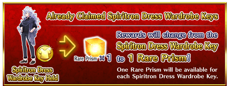 - If you already claimed a "Spiritron Dress Wardrobe Key" as a Mission or Quest Reward in the original event, the equivalent reward for completing that specific Mission or Quest will be a Rare Prism.