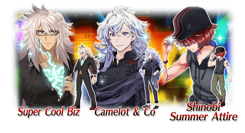 "Camelot & Co" for "★5 (SSR) Merlin", "Super Cool Biz" for "★4 (SR) Siegfried", and "Shinobi Summer Attire" for "★3 (R) Fuuma 'Evil-wind' Kotarou" are here!