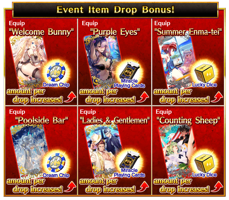 Servants equipped with the Limited Time Craft Essences "★5 (SSR) Welcome Bunny", "★5 (SSR) Poolside Bar", "★4 (SR) Purple Eyes", "★4 (SR) Ladies & Gentlemen", "★3 (R) Summer Enma-tei", and "★3 (R) Counting Sheep", available through the ongoing Pickup Summons,