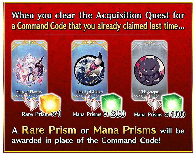 - If you already claimed a "Command Code" as a Mission Reward in the original event, the equivalent reward for completing that specific mission will be a Rare Prism or Mana Prisms.