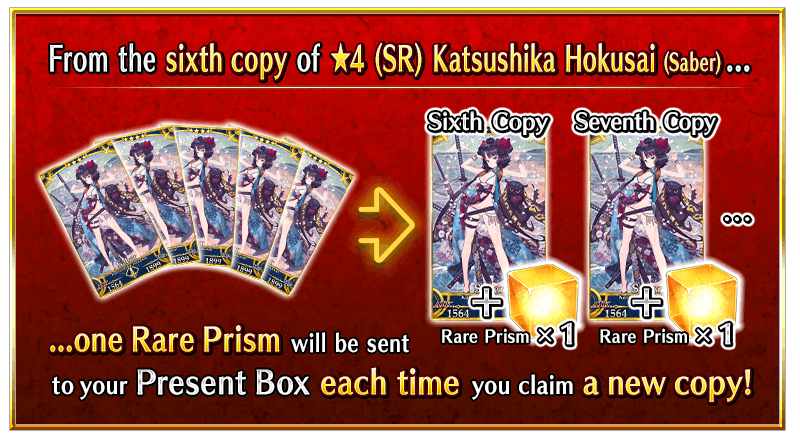 Once you have acquired a total of six copies of "★4 (SR) Katsushika Hokusai (Saber)", one Rare Prism will be awarded for each new copy, beginning with the sixth.