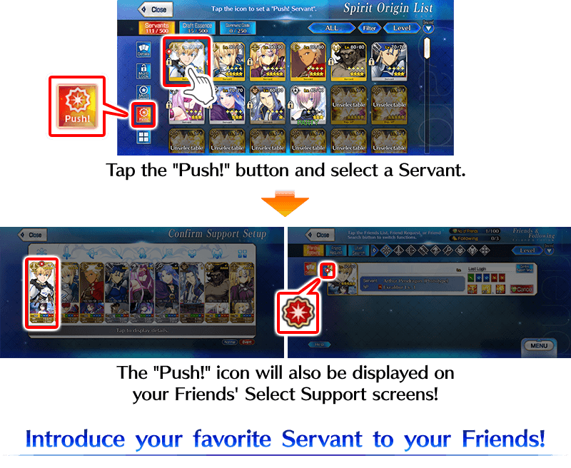 The "Push! Servant" function will let you show your favorite Servant to Friends and Followers.