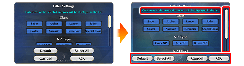 The text display area and button positions have been adjusted on the filter settings window viewable from the Select Servants screen and other screens. The scroll area has been enlarged.