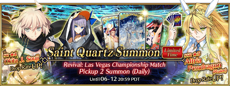 | 2022-05-29 21:00 - 05-30 20:59 PDT | ★5 Altria Pendragon (Ruler) | ★4 Mysterious Alter Ego Λ ★4 Okita J. Souji |