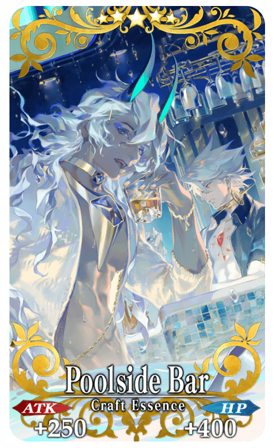 ★★★★★SSR Poolside Bar ATK 250 (MAX: 1000) HP 400 (MAX: 1600) Skill Increase Buster Card effectiveness by 10% & NP Gain by 10% & NP Strength by 15% for yourself + Increase Dream Chip amount per drop by 1 [Event Only]