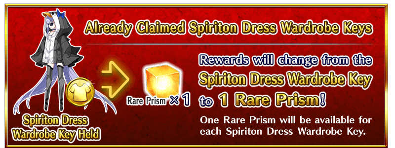 One Rare Prism will be available in place of the Spiritron Dress Wardrobe Key if you have already claimed it in 2021's Limited Time Event "All In! Las Vegas Championship March - Seven Duels of Swordbeauties!"