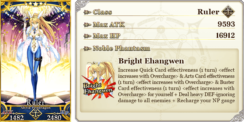 * Noble Phantasm animations for "★5 (SSR) Altria Pendragon (Ruler)" will change according to her Ascension stage. * The Noble Phantasm name for "★4 (SR) Okita J. Souji" will change according to her Ascension stage.