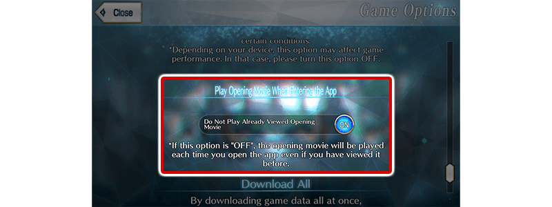 When this option is set to ON, the opening movie will not be played when entering the app if you have viewed it before. When set to OFF, the opening movie will play each time you enter the app.