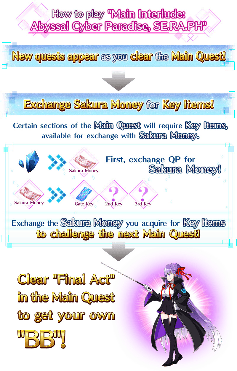 * "Unlock 'Main Interlude: Abyssal Cyber Paradise, SE.RA.PH'" and "BB (SR Moon Cancer) [For Noble Phantasm Enhancement]" will be permanently added to "Exchange Rare Prisms". There will be no time limit on exchange. * "Main Interlude: Abyssal Cyber Paradise, SE.RA.PH" will be available for exchange from "Exchange Rare Prisms" even if you clear it during the Special Release Period. * Quest Clear Rewards can only be claimed on first clear. After first clear, certain quests can be challenged repeatedly if all quests are cleared during the Special Release Period. * If you progressed part-way through "Main Interlude: Abyssal Cyber Paradise, SE.RA.PH" during the Special Release Period, your quest progress will be carried over when you exchange for "Unlock 'Main Interlude: Abyssal Cyber Paradise, SE.RA.PH'". * If you already hold enough copies of "★4 (SR) BB" to Enhance her Noble Phantasm to Level 5, "BB (SR Moon Cancer) [For Noble Phantasm Enhancement]" will not be available for exchange. * Rare Prisms will not be awarded for acquiring six or more total copies of "★4 (SR) BB" if they were acquired through "Exchange Rare Prisms".
