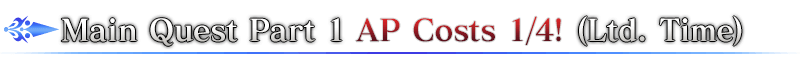 * AP costs have been permanently halved for the Main Quest through Part 2 Chapter 3. As such, AP costs for campaign eligible quests will return to 1/2 after the campaign ends. * Please note that Pseudo-Singularities I - IV and Free Quests will not be eligible for the campaign.