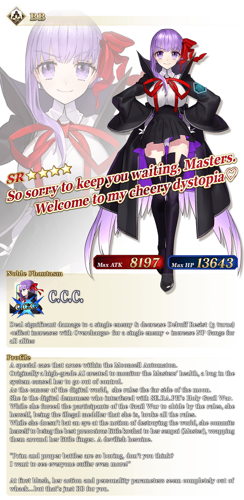 * "BB (SR Moon Cancer) [For Noble Phantasm Enhancement]" is scheduled to be added to "Exchange Rare Prisms" in the Da Vinci Workshop at 2022-06-27 21:00 PDT. Each copy will cost two Rare Prisms. However, if you already hold "★4 (SR) BB" and can raise her Noble Phantasm to Level 5, she will not be available for exchange. * If you acquire your sixth or further copy of "★4 (SR) BB" by clearing "Main Interlude: Abyssal Cyber Paradise, SE.RA.PH", one Rare Prism will be sent to your Present Box.