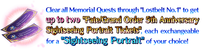 One "FGO 5th Anniversary Sightseeing Portrait Ticket" each will be awarded for clearing "2017 Memorial Quest (First Singularity)" and "2020 Memorial Quest (Lostbelt No.1)".