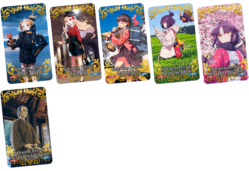 Sightseeing Portrait: Abigail Williams (Aomori Prefecture) Sightseeing Portrait: Ereshkigal (Saitama Prefecture) Sightseeing Portrait: Osakabehime (Hyogo Prefecture) Sightseeing Portrait: Katsushika Hokusai (Shizuoka Prefecture) Sightseeing Portrait: Katou "Black Kite" Danzo (Ibaraki Prefecture) Sightseeing Portrait: Yagyu Tajima-no-kami Munenori (Nara Prefecture) |