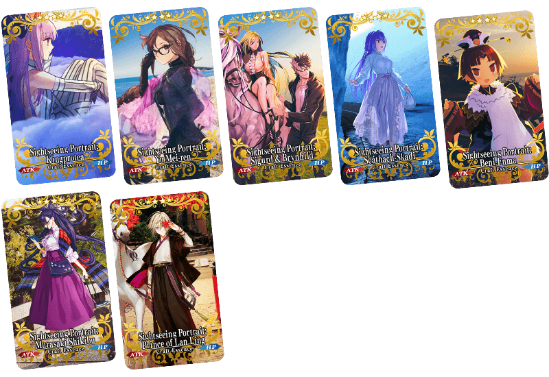 Sightseeing Portrait: Kingprotea (Nagano Prefecture) Sightseeing Portrait: Yu Mei-ren (Fukui Prefecture) Sightseeing Portrait: Sigurd & Brynhild (Miyazaki Prefecture) Sightseeing Portrait: Scáthach-Skadi (Toyama Prefecture) Sightseeing Portrait: Beni-Enma (Ishikawa Prefecture) Sightseeing Portrait: Murasaki Shikibu (Okayama Prefecture) Sightseeing Portrait: Prince of Lan Ling (Hiroshima Prefecture) |