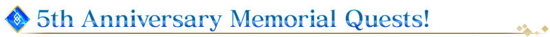 To commemorate the fifth anniversary, we'll be holding the "Fifth Anniversary Memorial Quests", a collection of the most memorable battles from "First Singularity: Hundred Years' War of the Evil Dragons, Orleans" to "Lostbelt No.5: Ancient Ocean of the Dreadnought Gods, Atlantis"!