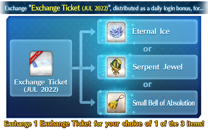 The "Exchange Ticket (JUL 2022)" distributed as a daily login bonus will be exchangeable for the following items.
