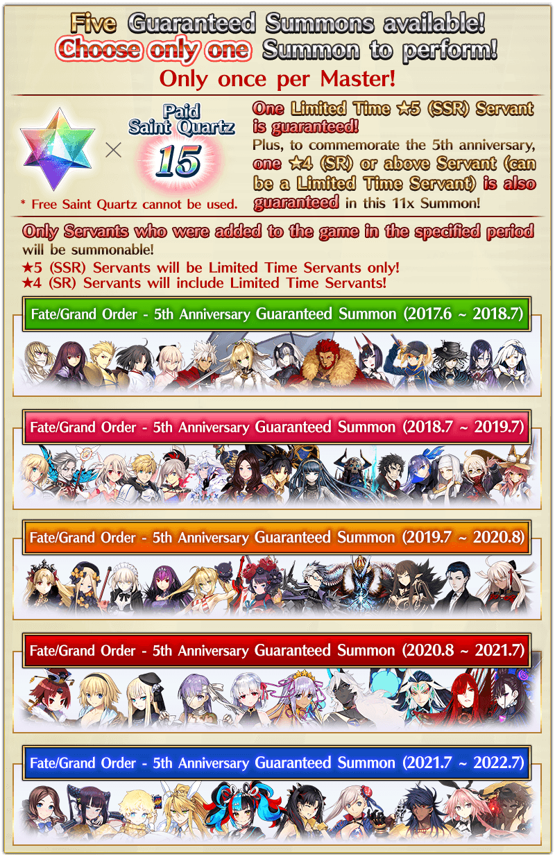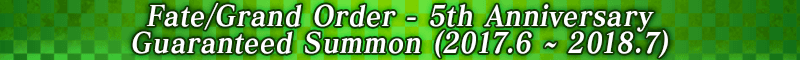 * All Limited Time ★5 (SSR) Servants and all ★4 (SR) and below Servants released between 2017-06-26 - 2018-07-06 PDT will be summonable in the "Fate/Grand Order - 5th Anniversary Guaranteed Summon (2017.6 ~ 2018.7)".