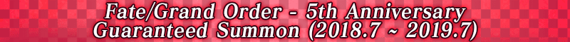 * All Limited Time ★5 (SSR) Servants and all ★4 (SR) and below Servants released between 2018-07-07 - 2019-07-05 PDT will be summonable in the "Fate/Grand Order - 5th Anniversary Guaranteed Summon (2018.7 ~ 2019.7)".