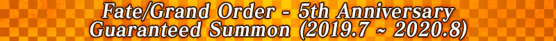 * All Limited Time ★5 (SSR) Servants and all ★4 (SR) and below Servants released between 2019-07-06 - 2020-08-02 PDT will be summonable in the "Fate/Grand Order - 5th Anniversary Guaranteed Summon (2019.7 ~ 2020.8)".
