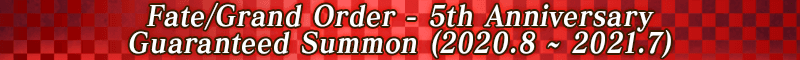 * All Limited Time ★5 (SSR) Servants and all ★4 (SR) and below Servants released between 2020-08-03 - 2021-07-02 PDT will be summonable in the "Fate/Grand Order - 5th Anniversary Guaranteed Summon (2020.8 ~ 2021.7)".