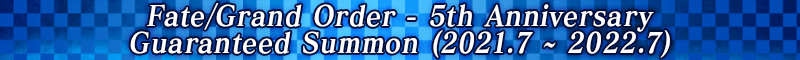 * All Limited Time ★5 (SSR) Servants and all ★4 (SR) and below Servants released between 2021-07-03 - 2022-07-03 PDT will be summonable in the "Fate/Grand Order - 5th Anniversary Guaranteed Summon (2021.7 ~ 2022.7)".