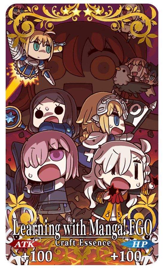 ★★★★SR Learning with Manga! FGO ATK 100 (MAX: 100) HP 100 (MAX: 100) Skill Increases the amount of Master EXP gained by 50 when a quest is cleared |