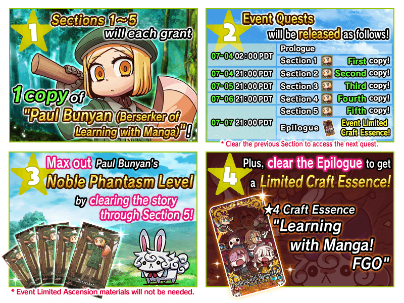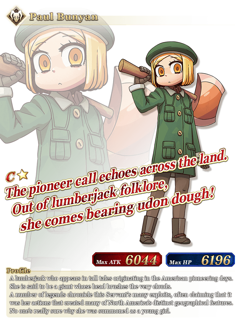 Clear the event quests unlocked on a daily basis to officially add the Event Limited Servant "★1 (C) Paul Bunyan (Berserker of Learning with Manga)" to your roster!