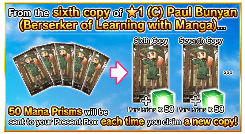 Once you have acquired a total of six copies of "★1 (C) Paul Bunyan (Berserker of Learning with Manga)", 50 Mana Prisms will be awarded along with each new copy, beginning with the sixth.