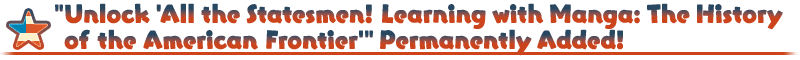 Starting 2022-07-10 21:00 PDT, "Unlock 'All the Statesmen! Learning with Manga: The History of the American Frontier'" will be permanently added to "Exchange Rare Prisms" in the Da Vinci Workshop.