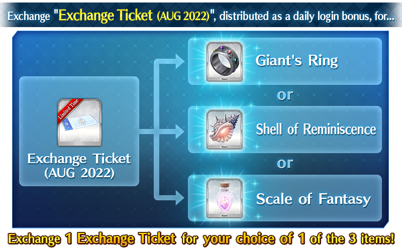 The "Exchange Ticket (AUG 2022)" distributed as a daily login bonus will be exchangeable for the following items.