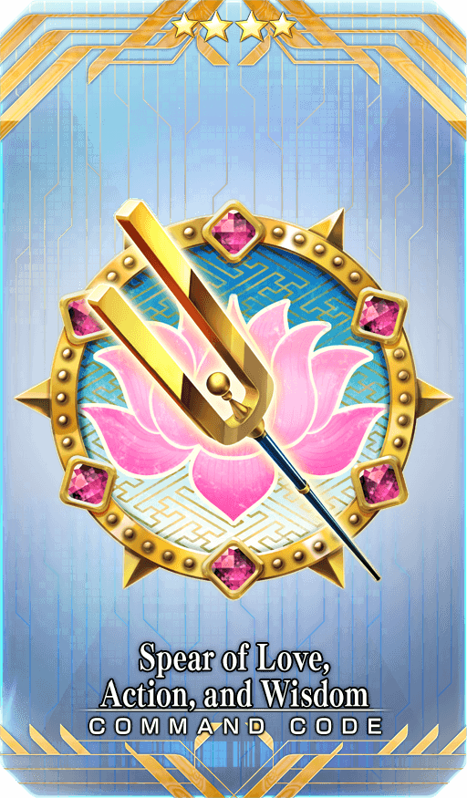 ★★★★SR Spear of Love, Action, and Wisdom Skill Gain 2 C. Stars when attacking with the engraved Card + Apply 20% Special Attack [Charm] effect to the engraved Card * You can only claim this Command Card if you did not receive it in 2021’s Limited Time Event “Tokugawa Restoration Labyrinth, Ooku”.