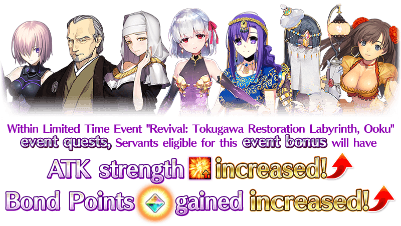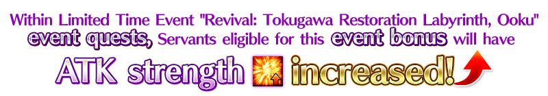 Within Limited Time Event "Revival: Tokugawa Restoration Labyrinth, Ooku" Event Quests, Certain Servants will be eligible to receive a bonus to their ATK strength, as well as a bonus to Bond Points gained upon clearing quests!
