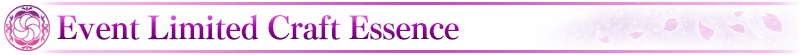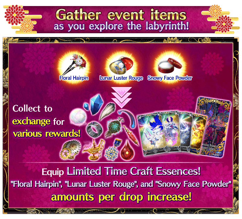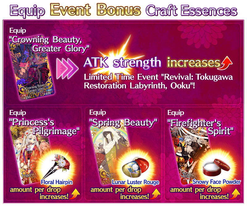 Servants equipped with the Limited Time Craft Essences "★5 (SSR) Princess's Pilgrimage", "★4 (SR) Spring Beauty", and "★3 (R) Firefighter's Spirit", available through the ongoing Pickup Summon, will receive a bonus to the amount per drop of event items "Floral Hairpin", "Lunar Luster Rouge", and "Snowy Face Powder".