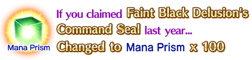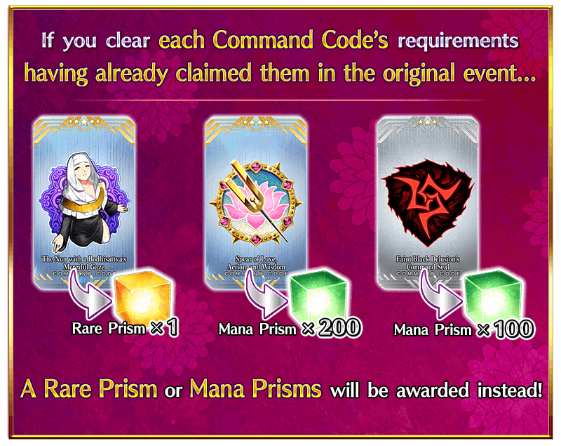 - If you claimed an "Command Code" in the original event, the equivalent reward for certain quests in this event will be a Rare Prism or Mana Prisms.