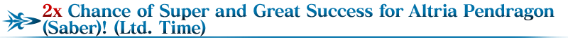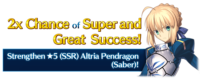 For a limited time, there will be a double chance of Super Success (double EXP) and Great Success (triple EXP) when performing Enhancement on "★5 (SSR) Altria Pendragon (Saber)"!